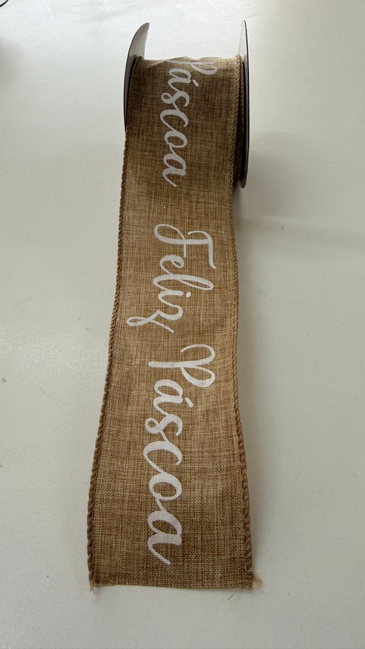 Fita aramada crua com Feliz Páscoa branco 6,3cmx9,14m