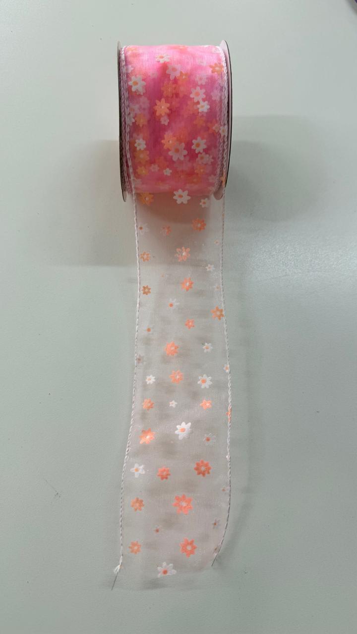 Fita aramada rosa transparente florida 6,3cmx9,14m