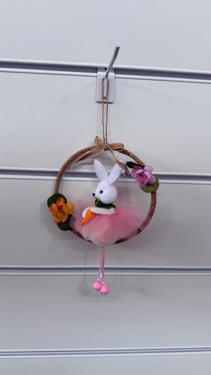 Guirlanda com coelha de saia rosa, com 15cm de diâmetro.