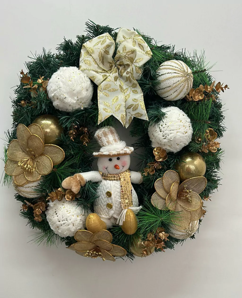 Guirlanda de Natal branca e dourada com boneco de neve 60cm