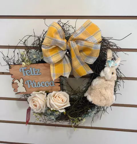 Guirlanda de Páscoa com coelho e plaquinha, com 30cm de diâmetro