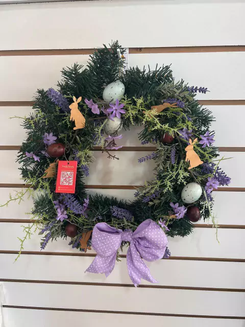 Guirlanda de Páscoa com laço poá lilás e cordão de coelhos, com 40cm de diâmetro.