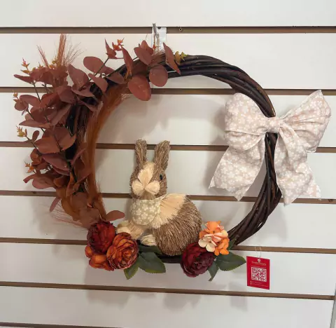 Guirlanda de Páscoa de vime com coelho de palha com 35cm de diâmetro.