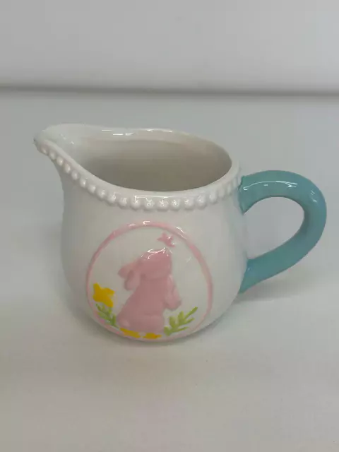 Jarrinha de porcelana branca com relevo de coelho rosa e alça azul, com 9cm de altura.
