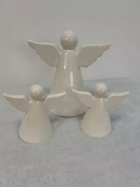 Jogo 3 anjos brancos de porcelana, um com 16cm altura e dois com 10cm altura.