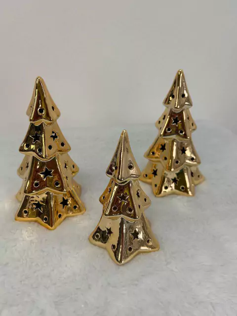 Jogo 3 árvores douradas porcelana, duas com 15cm altura e uma de 12 cm de altura