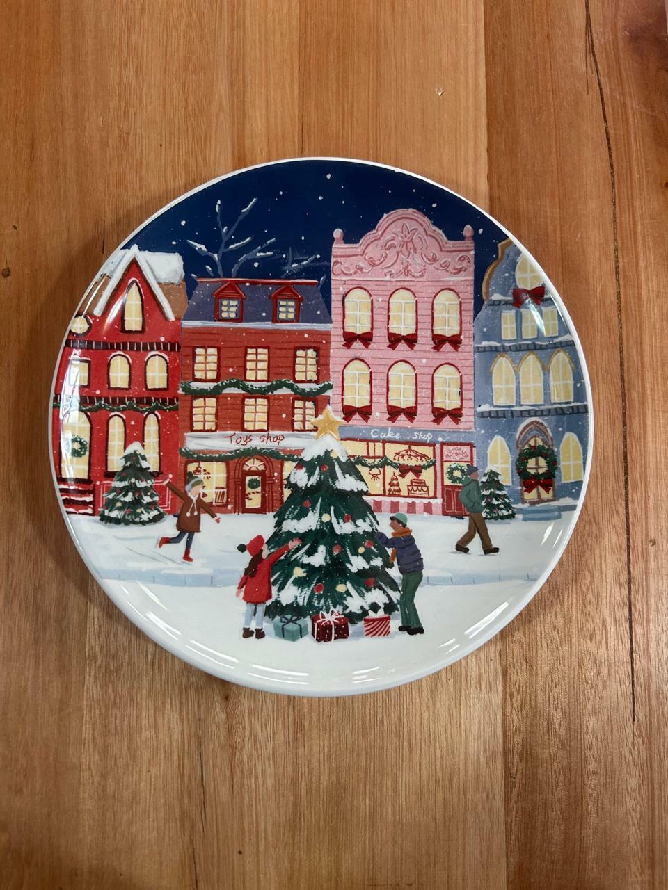 Kit com 6 pçs prato sobremesa Vila Natal de cerâmica, com 21cm de diâmetro.