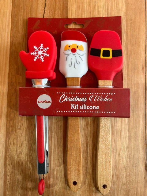 Kit utensílios silicone de Natal, com espátula, pegador e colher.