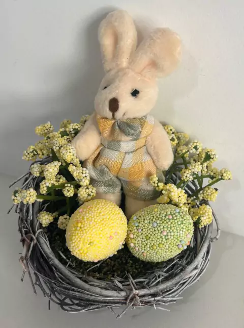 Mini arranjo ninho rústico com coelho 12x10cm quantidade