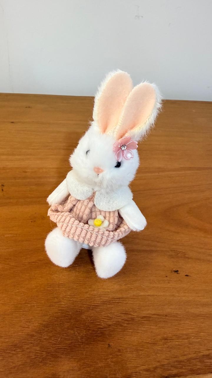 Mini coelha branca com vestido rosa, com 11cm de altura.
