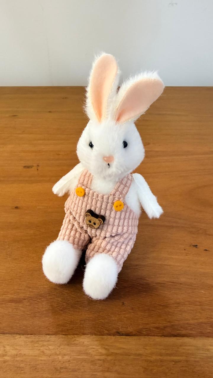 Mini coelho branco com macacão rosa, com 11cm de altura.