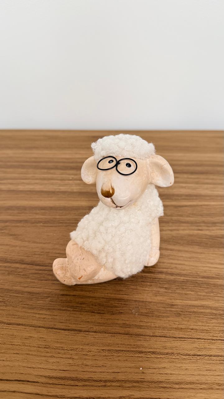 Ovelha sentada pernas cruzadas e óculos com 9,5cm de altura.