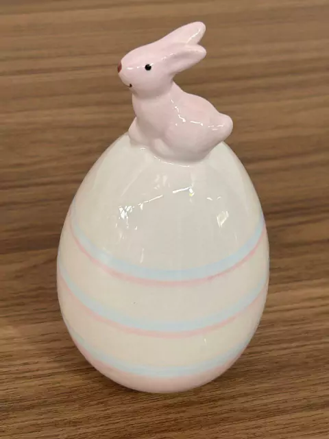 Ovo de porcelana branco com detalhes rosa e azul, com coelho rosa, 14cm de altura