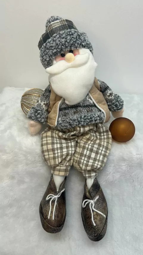 Papai Noel sentado com perninhas moles e roupa xadrez, com 38cm de altura.