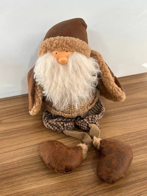 Papai noel sentado com roupa de tricô e casaco e gorro de couro, com pernas moles, com 26cm sem contar as perninhas e 64cm de altura no total.