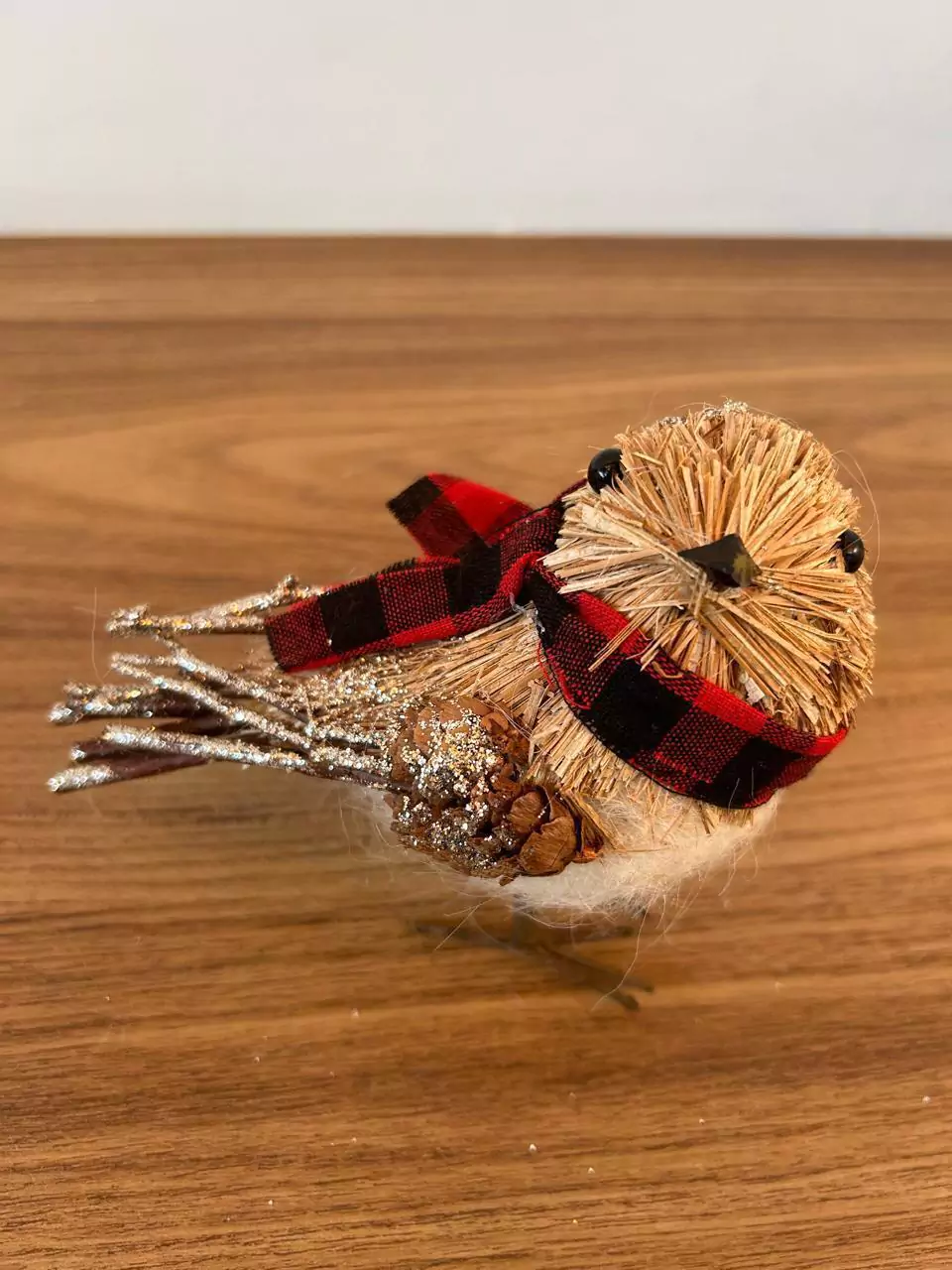 Pássaro de palha e fibra, cachecol xadrez vermelho, com 12cm altura