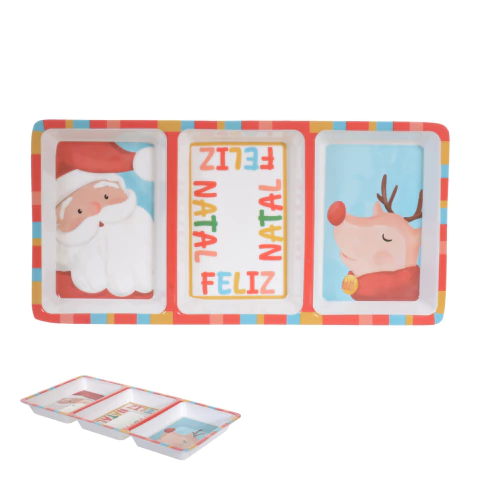 Petisqueira melamina Noel aquarela com 3 divisões, com 31x15cm