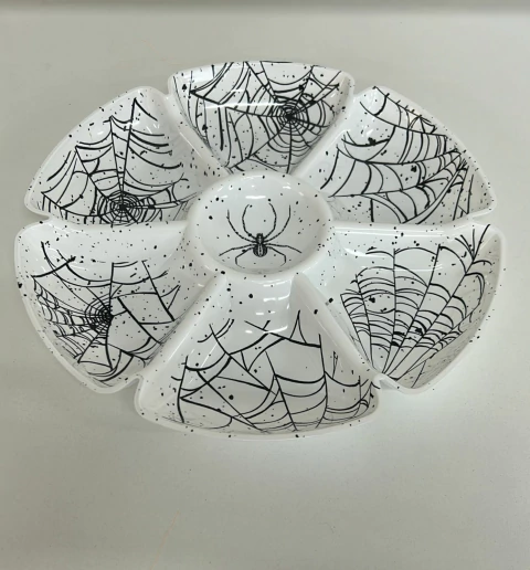 Petisqueira teia aranha melamina, com 6 divisões, e 30cm de diâmetro.