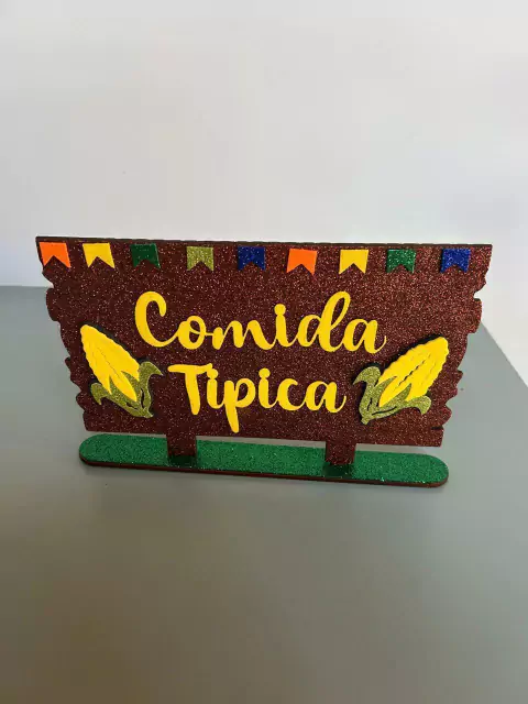 Placa de madeira com EVA “Comida Típica” para mesa de festa junina, com 24x16cm