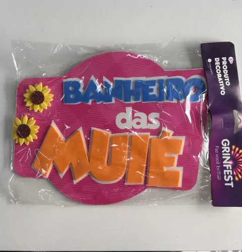 Placa decorativo “Banheiro das Muié” de madeira para festa junina, com 29x23cm