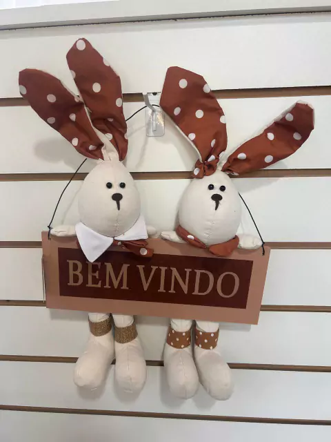 Placa decorativa com casal de coelhos com 30cm de largura.