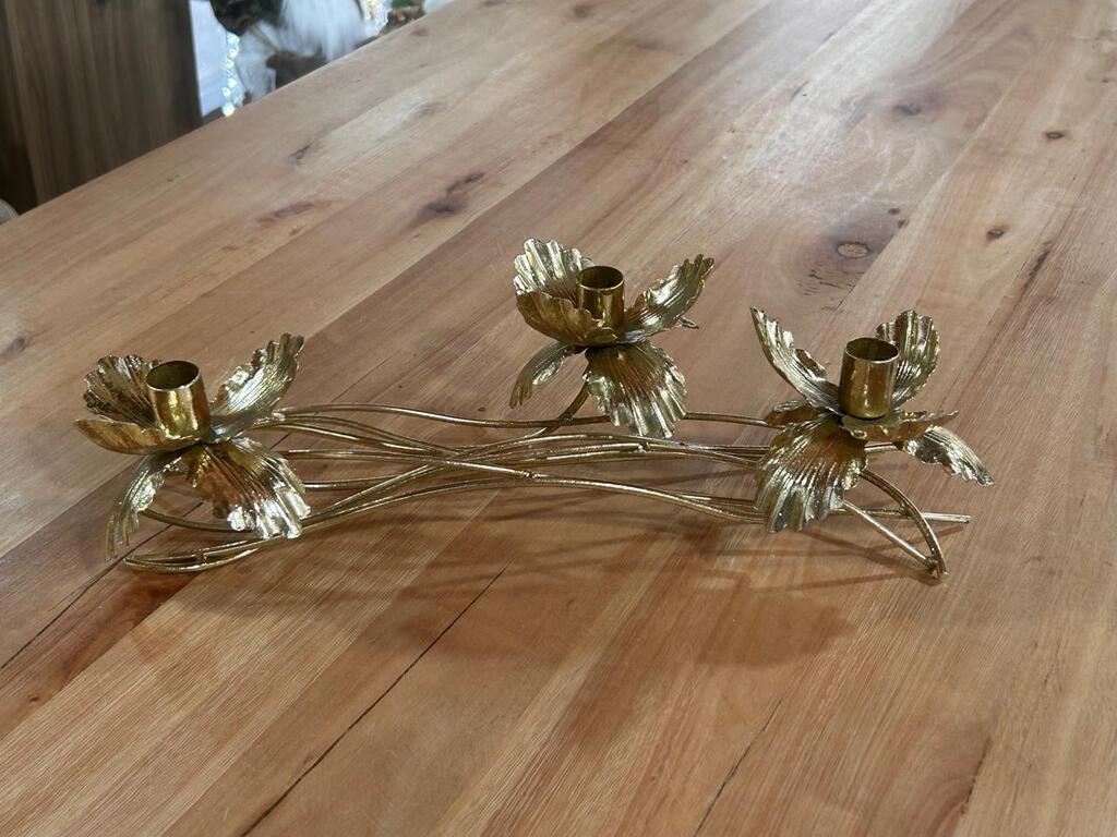 Porta velas de metal dourado, com 3 suportes, com 40cm de comprimento
