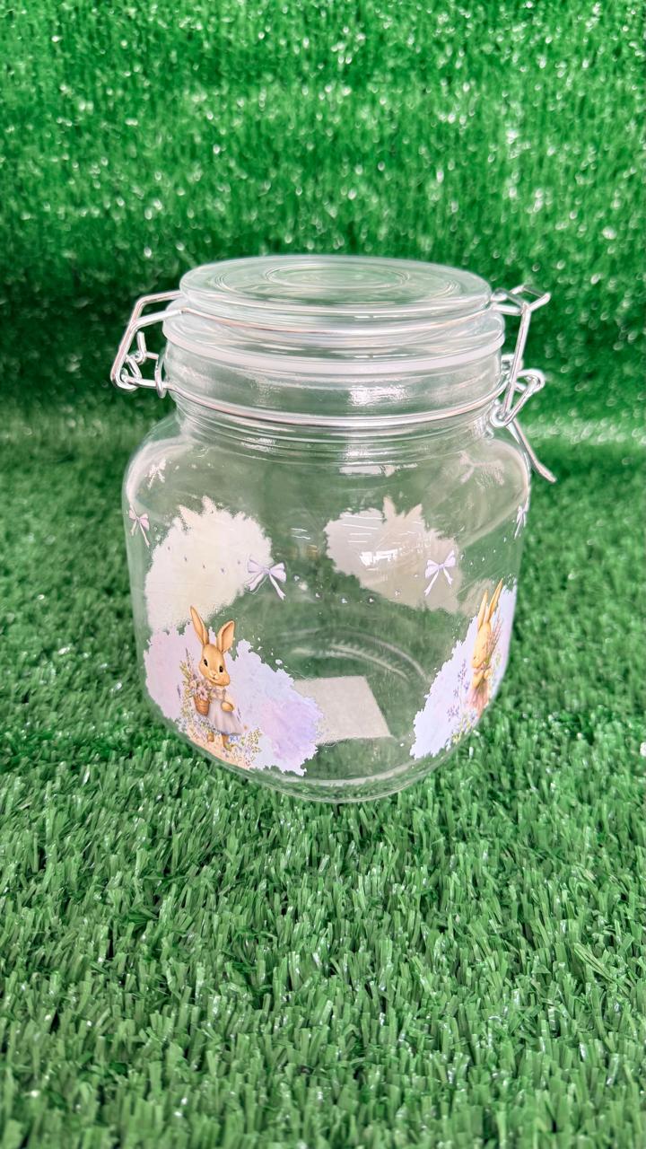 pote vidro com tampa com coelhos