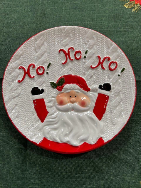 Prato decorativo de louça branco com Noel Ho Ho Ho, 25cm de diâmetro.