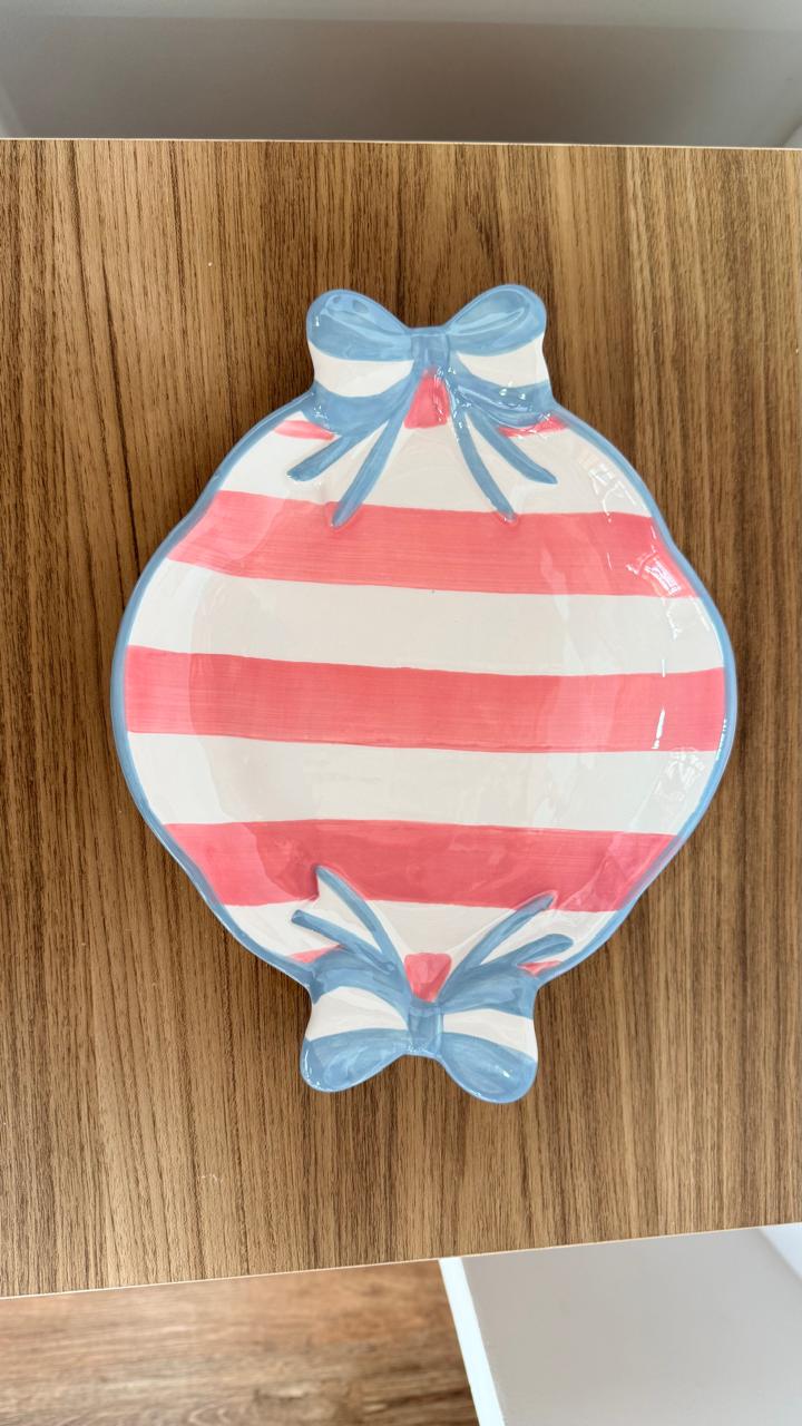 Prato decorativo louça rosa e azul com laços com 27x21x3,80cm