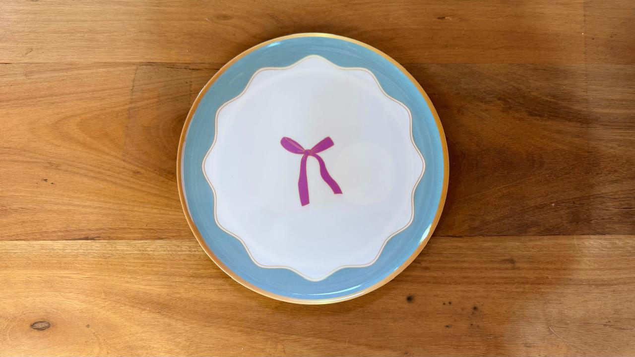 Prato raso de melamina com laço rosa, com 25cm de diâmetro.