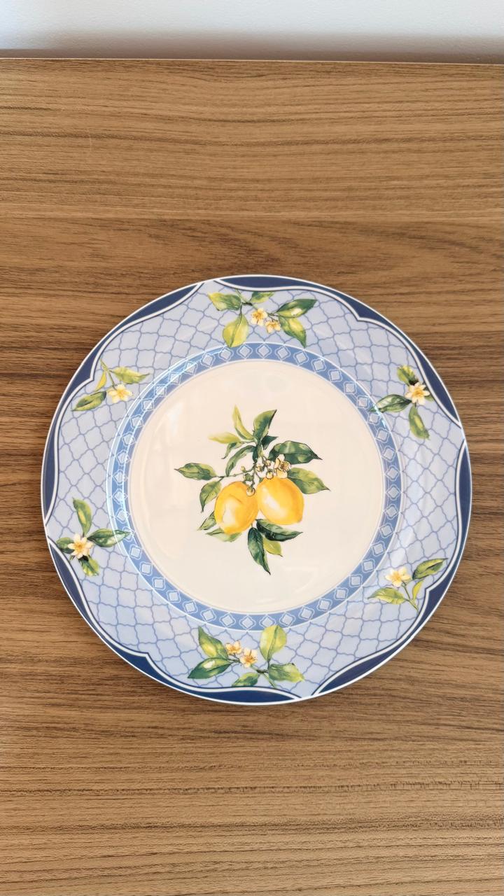 Prato de sobremesa porcelana de limão siciliano com azul, com 19cm de diâmetro