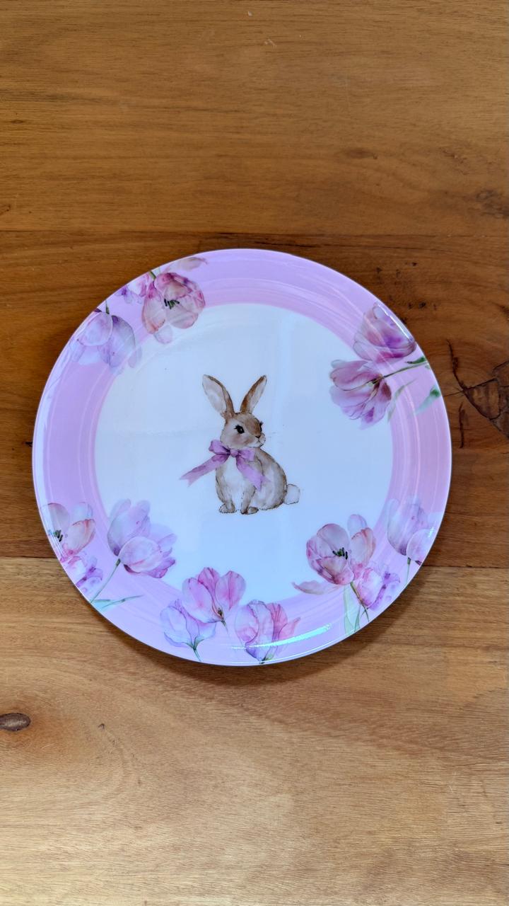 Prato de sobremesa de melamina com coelha e flores lilás