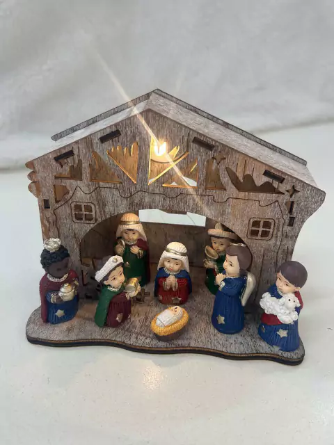 Presépio em madeira e peças em resina, com luz, com 15x12cm