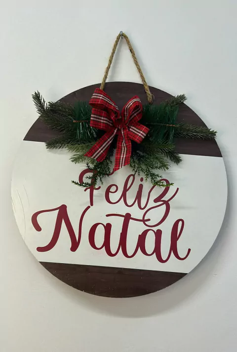 Quadro decorativo branco Feliz Natal de madeira com 35cm diam.