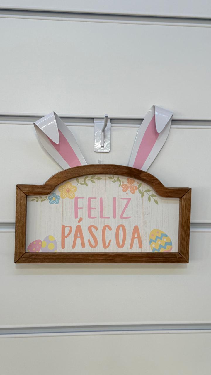 Quadro de madeira com orelhas de metal Feliz Páscoa 24,5x28cm