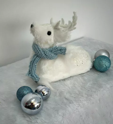 Rena branca deitada com cachecol azul com 19cm de comprimento,