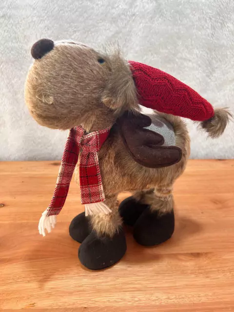 Rena em pé marrom retrátil, com 32cm com as pernas recolhidas e 43cm de altura com as pernas esticadas.