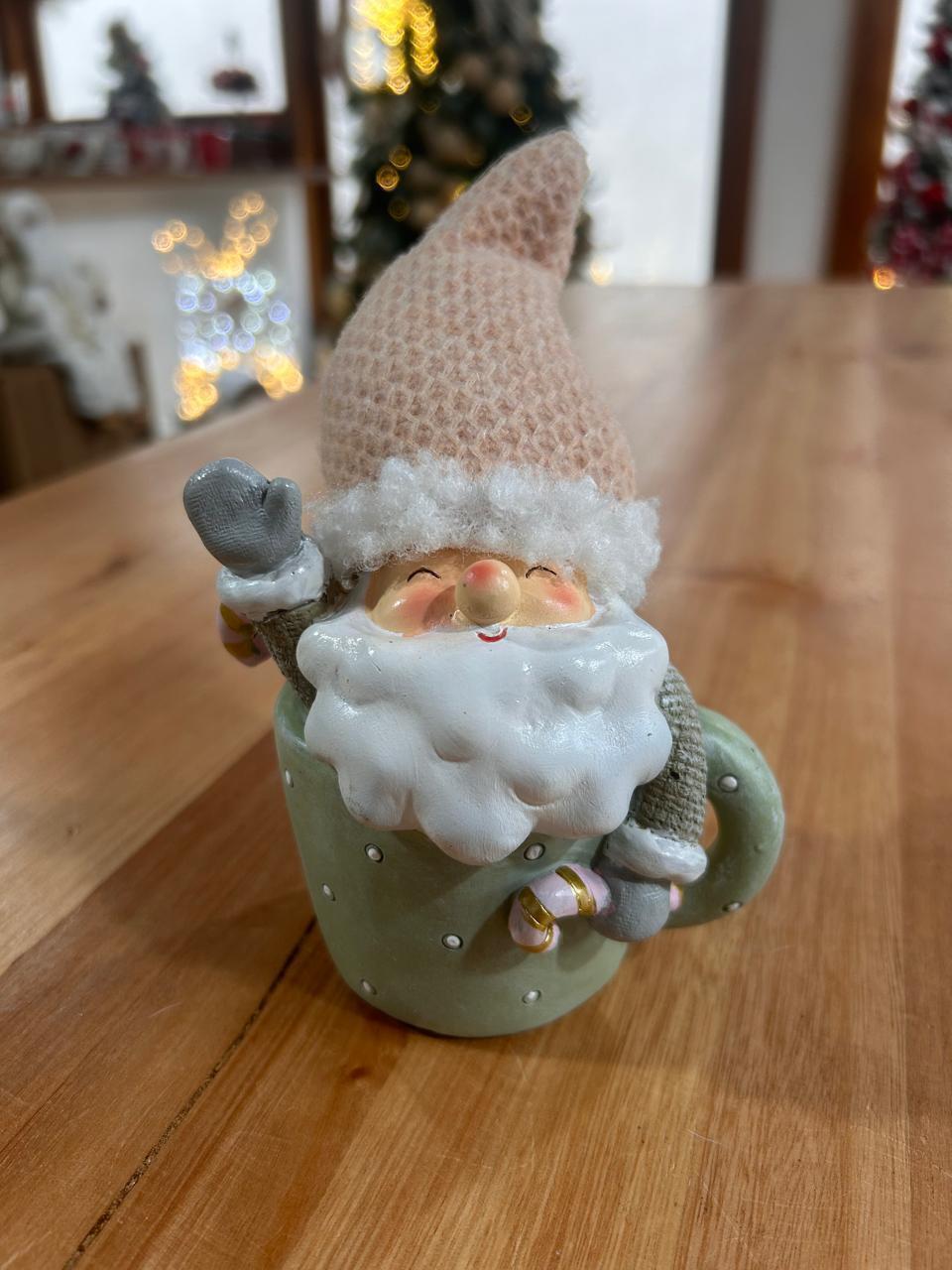 Noel na caneca verde em resina, com 14cm de altura.