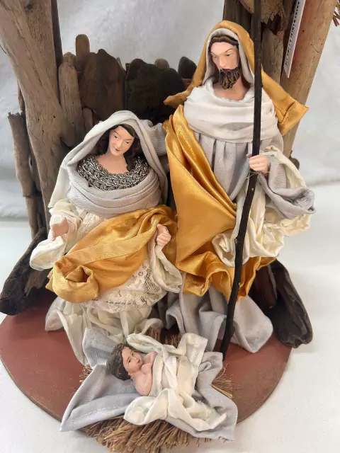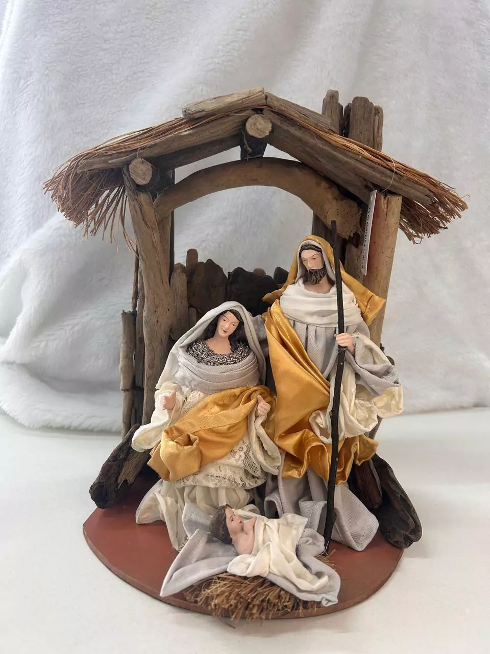 Sagrada família cabana madeira, com roupas em tecido, com 24cm de altura