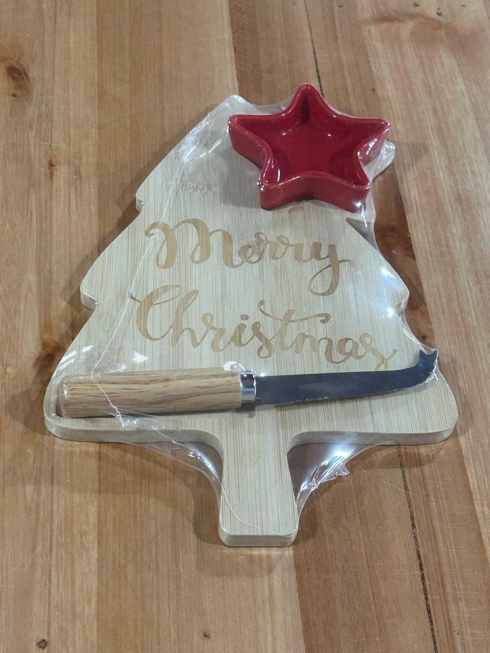 Tábua para petiscos de madeira em formato de árvore 30x20cm, com potinho de louça de estrela vermelho e faca para queijos.