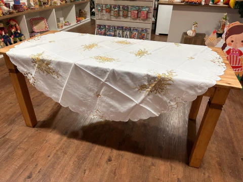 Toalha de mesa redonda crua com bordado dourado 1,80x1,80m quantidade