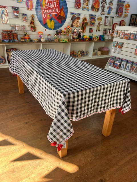 Toalha de mesa xadrez branca e preta com passa fita vermelha, com medida 2,40×1,40m
