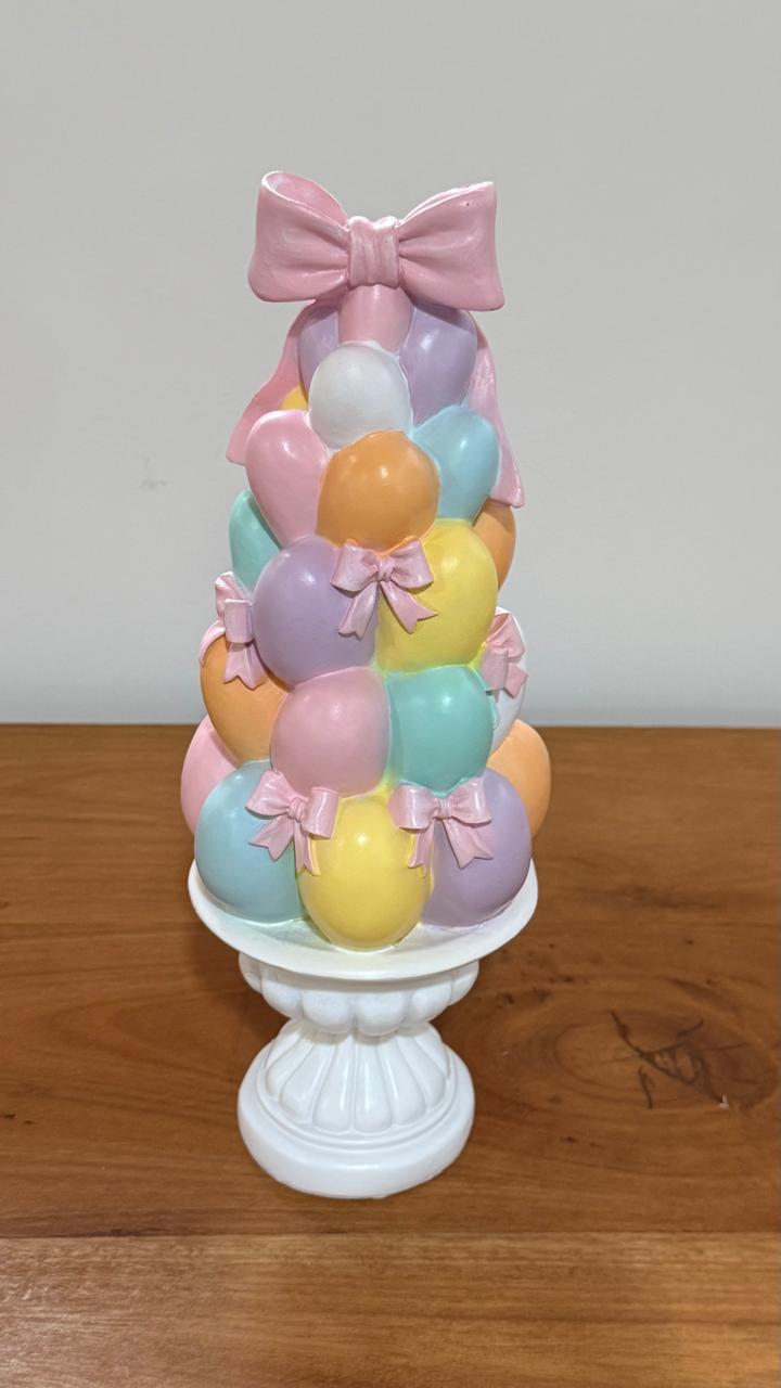 Topiaria em resina decorativa de ovos coloridos e laços cor de rosa, com 31cm de altura.