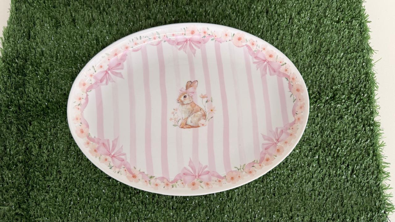 Travessa vidro opalino branco e rosa com flores e coelho 24x33cm