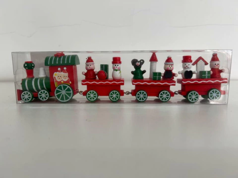 Trenzinho vermelho natalino de madeira, com 24cm de comprimento.