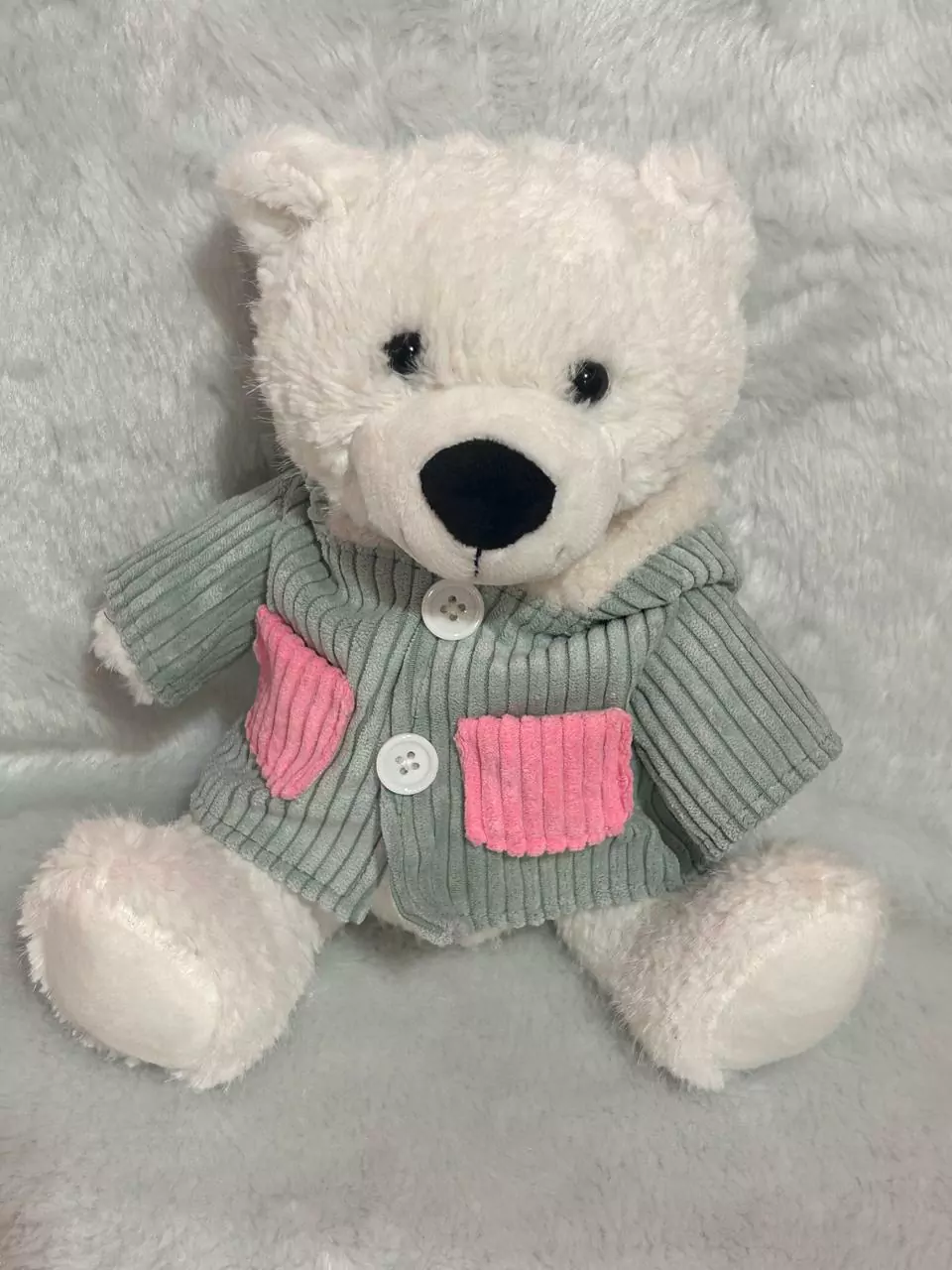 Urso branco de pelúcia com roupa azul 24cm