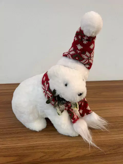 Urso sentado branco de pelúcia com gorro vermelho com 25cm de altura