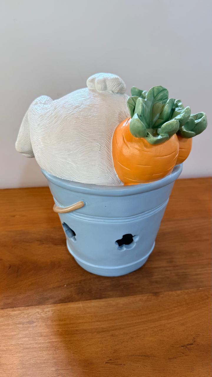 Vaso azul de resina com coelho e cenouras 28cm quantidade