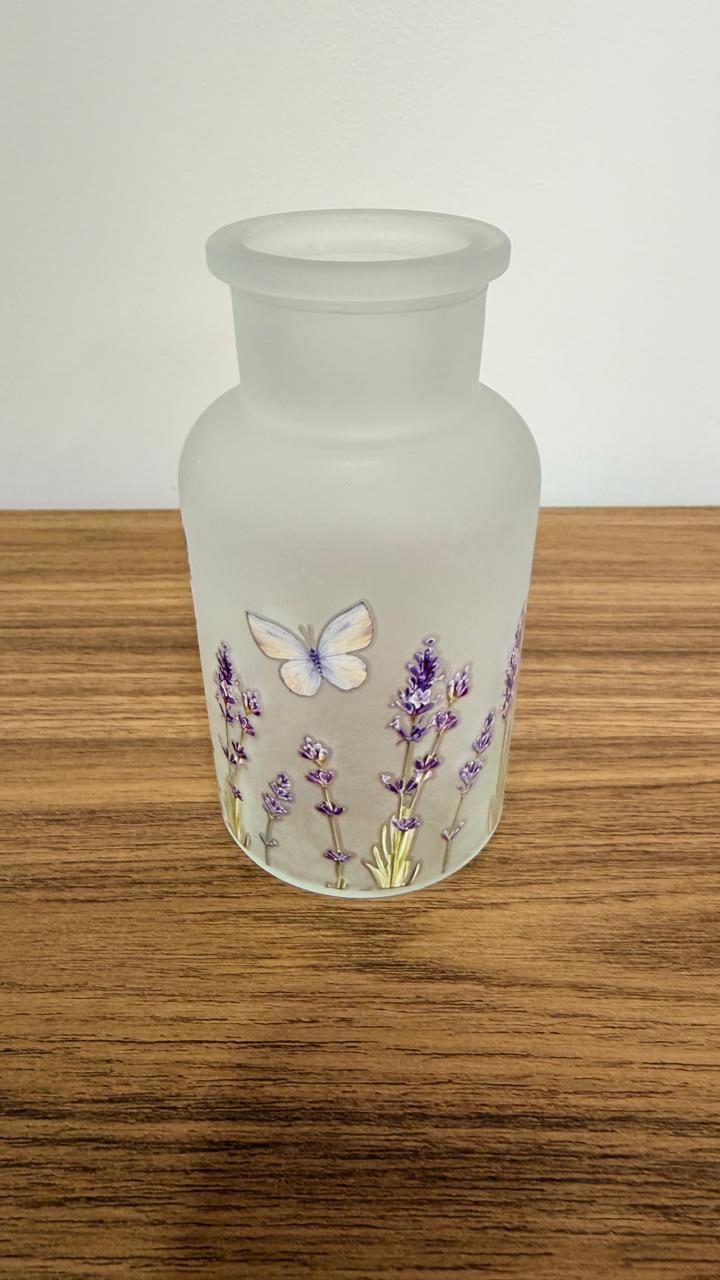 Vaso decorativo de vidro com desenhos de lavanda e borboleta com 12,5cm de altura.