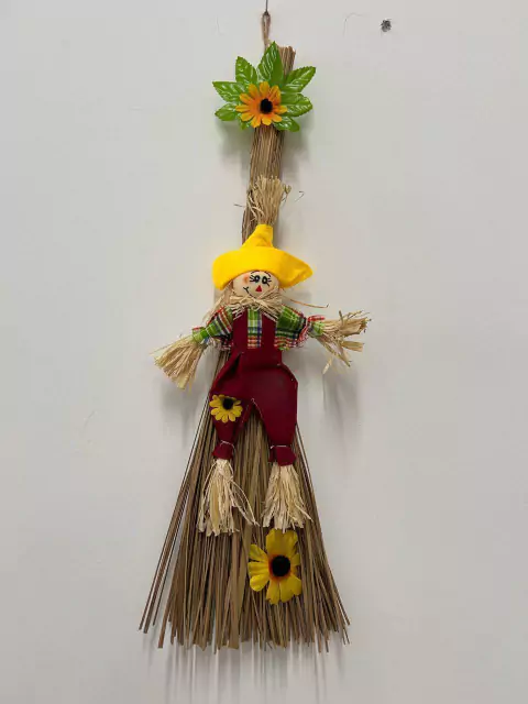 Vassoura de palha decorativa, com espantalho, com 50cm de altura.
